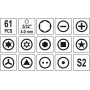 Набір для обслуговування мобільних телефонів, смартфонів, планшетів, навігації та ремонту годин та окулярів. У наборі 61 предмет. Склад набору: 1x 1/4" адаптер. 1x алюмінієва ручка. 1x розширення. 1x гнучке розширення. 56x біт. 1x пластикова ручка для відкривання/піддягання.