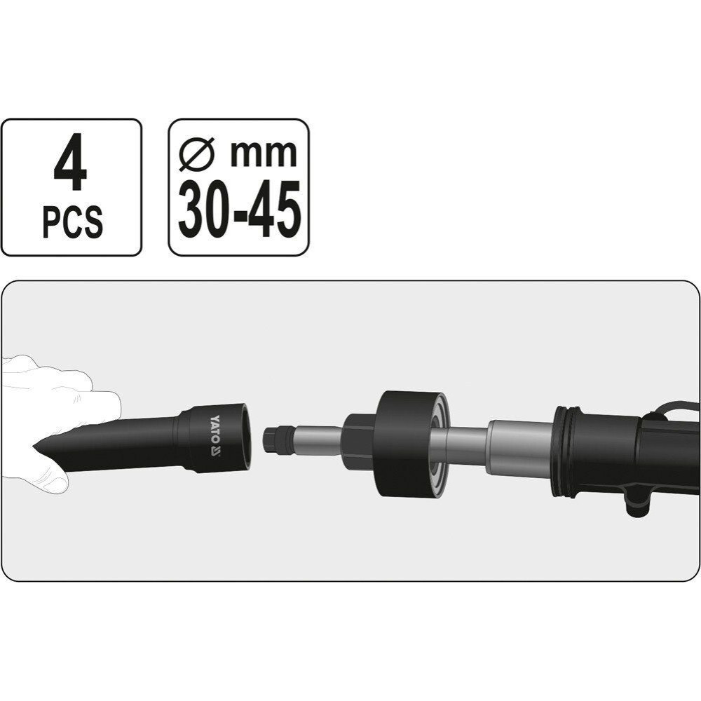 Професійний комплект рульової рейки з 4 предметів, який включає ручку і три змінні головки. Робочі діапазони: 30 мм - 35 мм, 35 мм - 40 мм, 40 мм - 45 мм. Матеріал: вуглецева сталь.